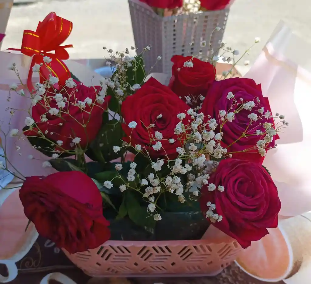 6 rosas rojas Moño cinta papel Papel decorativo Bandeja plastica