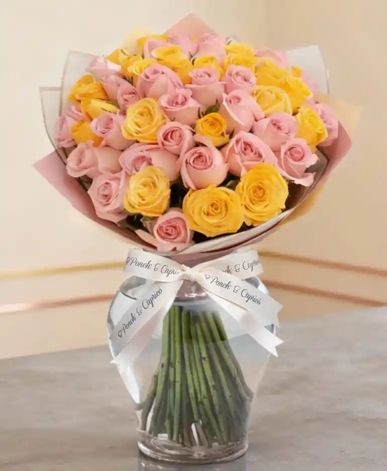 hermoso Bouquet con 50 rosas amarillas y rosadas en jarrón. papel decorativo,, moño ya tarjeta con mensaje personalizado