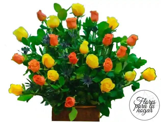 Rosas amarillas x12 y rosas naranjas x12 en base rustica