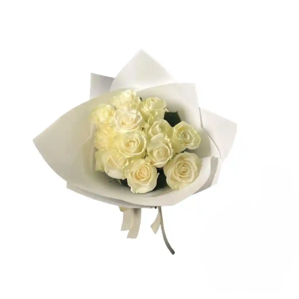 12 rosas blancas en bouquet incluye decoracion y mensaje personalizado Nota: el color y el diseño de la envoltura puede variar segun disponibilidad