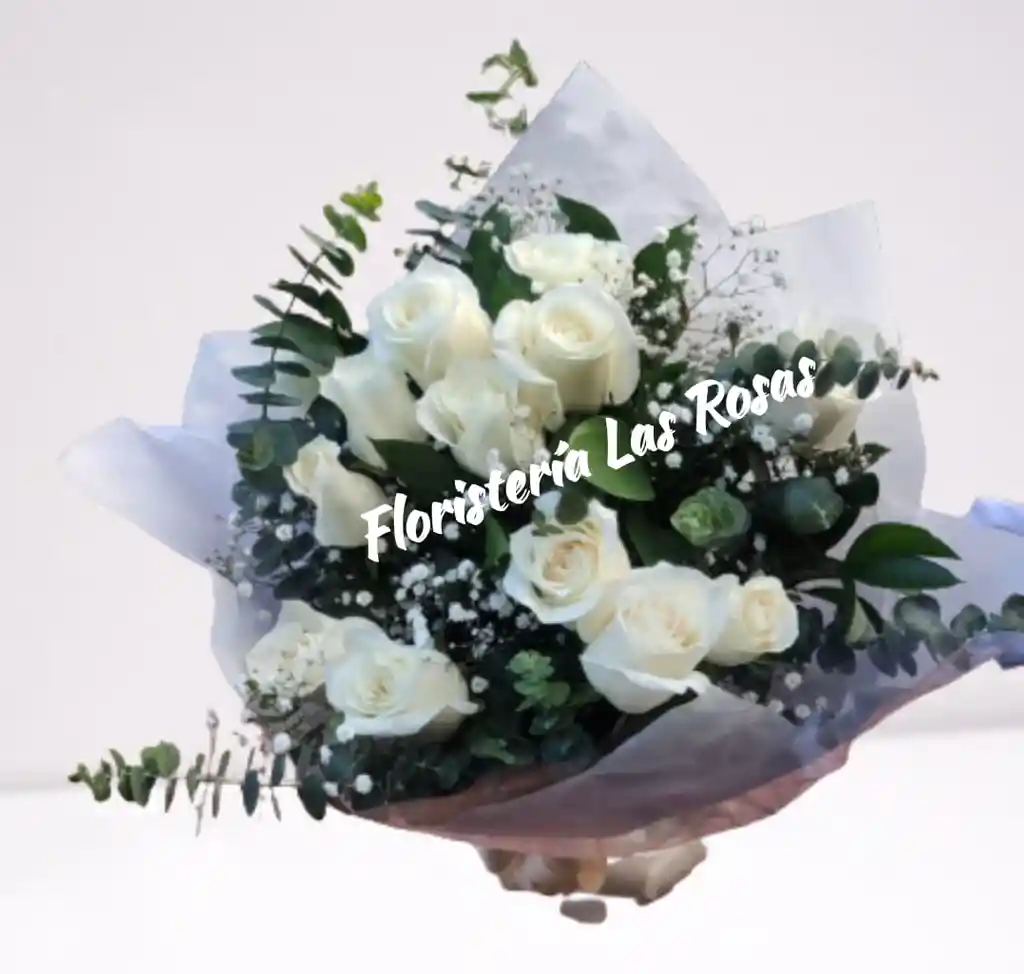 BOUQUET REDONDO DE 12 ROSAS BLANCAS INCLUYE FOLLAJES VERDES Y BLANCO DECORACION MOÑO Y TARJETA