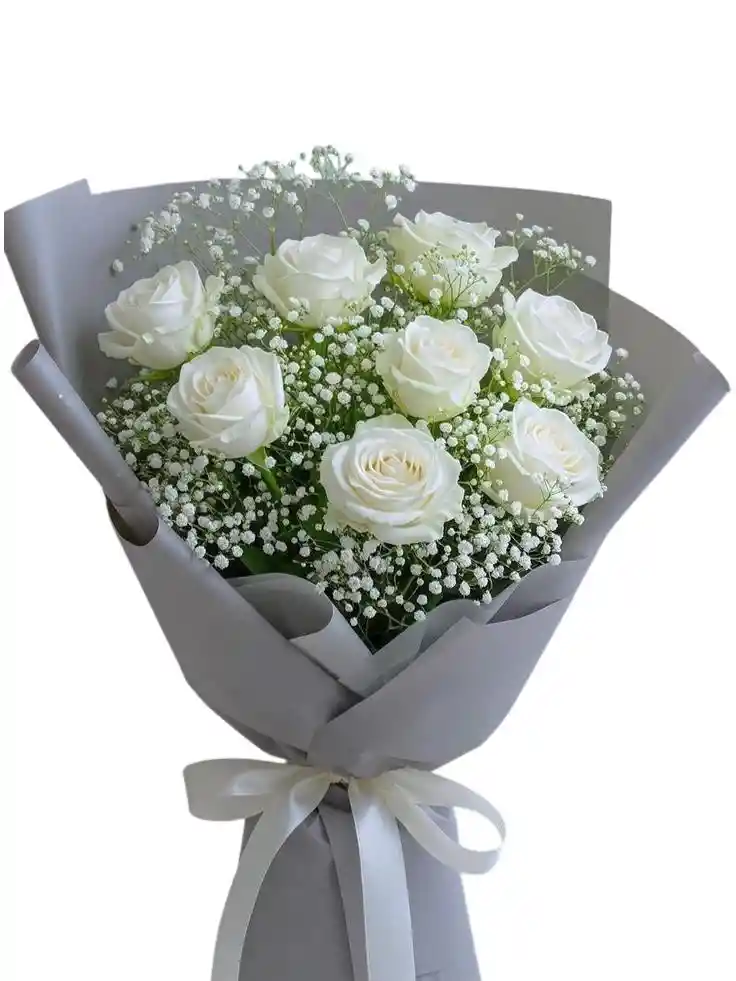 Ramo floral con 10 unidades con rosas blancas y follaje en papel coreano