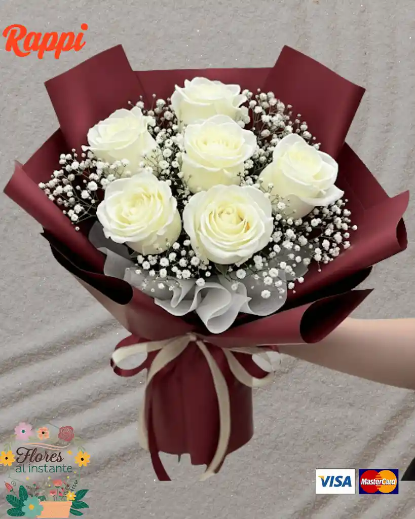 Este es un bouquet de mano compuesto por 6 rosas blancas que simbolizan pureza e inocencia. Las flores están combinadas con gipsófila, lo que le da un toque delicado y aireado al arreglo. El ramo está envuelto en un elegante papel coreano color vino tinto, creando un contraste sofisticado y perfecto para cualquier ocasión especial.
