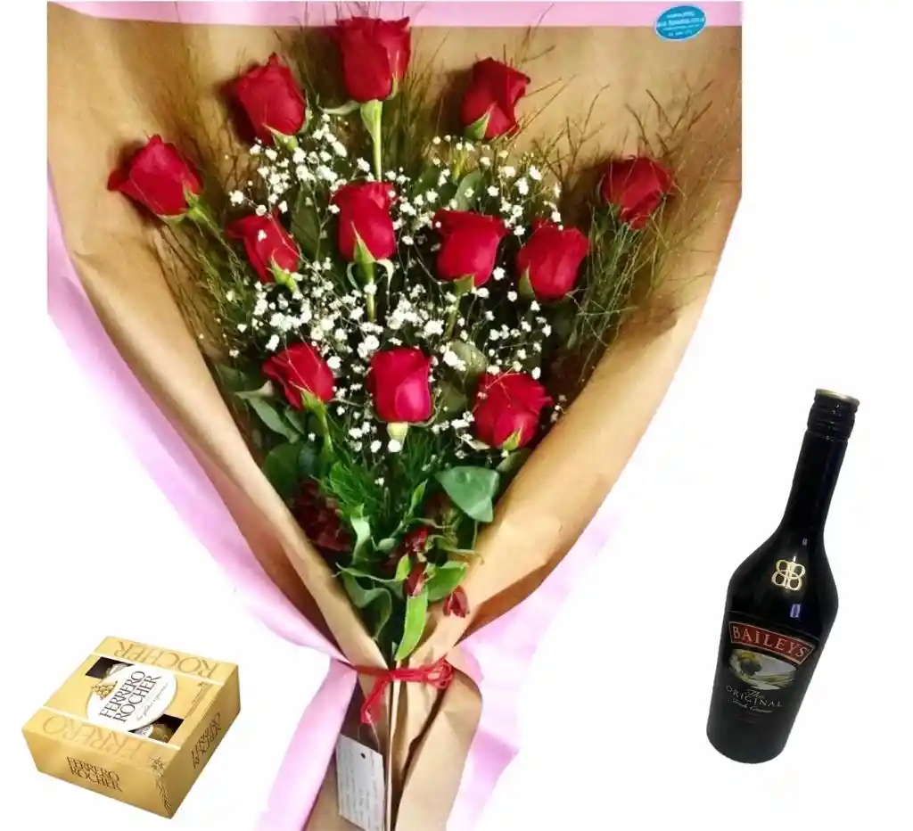 contiene: 12 rosas rojas y follaje en bouquet , caja de ferrero rocher x4, crema de whisky baileys incluye decoración y mensaje personalizado Puedes dejar tus mensajes en el chat del RT, nosotros los veremos. IMAGEN DE REFERENCIA