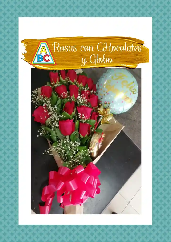CONTIENE 18 ROSAS ROJAS, FOLLAJE, CAJA DE CHOCOLATE, GLOBO METALIZADO, PAPEL DECORATIVO Y LAZO