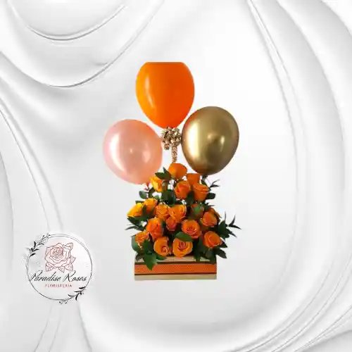 Un arreglo floral con 18 rosas de color naranja, base rectangular decorativa hay tres globos de diferentes colores: naranja, dorado y rosa si desea agregar nota personalizada escribirla en el chat.