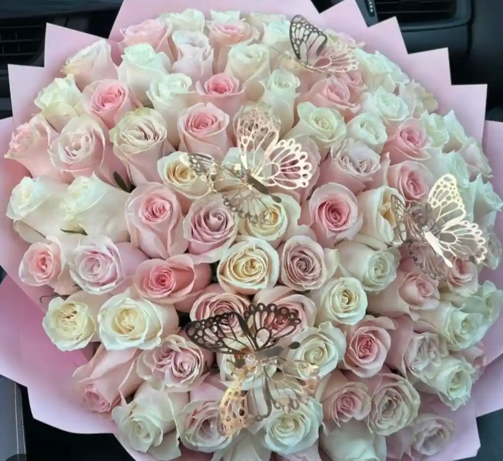 20 rosas blancas, 20 rosas rosadas calidad exportación con follaje, y mariposas.