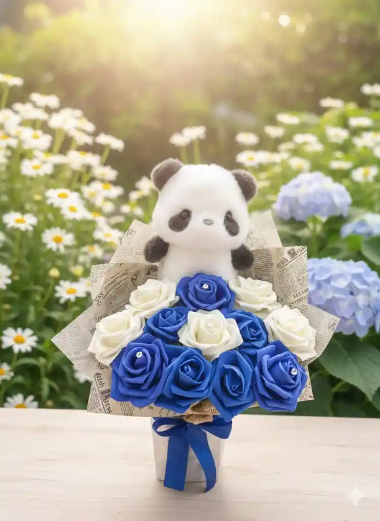 Arreglo de 12 flores eternas, acompañado de un hermoso peluche.
