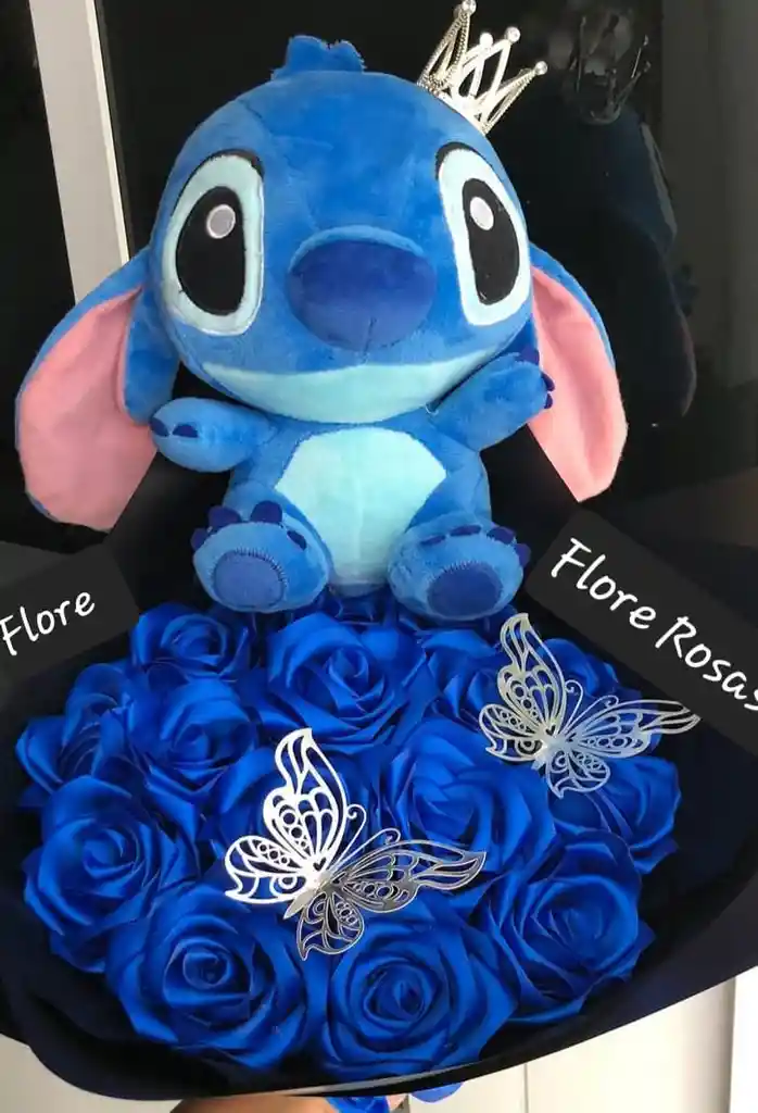 Hermoso bouquet con 10 rosas eternas azules,, Stitch mediano azul, papel decorativo, moño, accesorios, tarjeta con mensaje personalizado