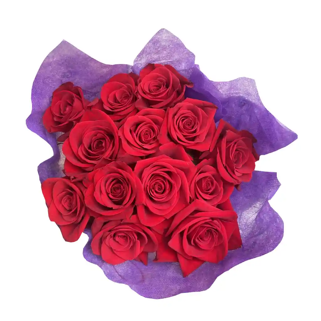 Ramo x 12 rosas de exportación color rojo de 50-60 cm de largo. Follaje. Alimento para flores y tarjeta. Este ramo viene en espiral para colocar inmediatamente en florero.