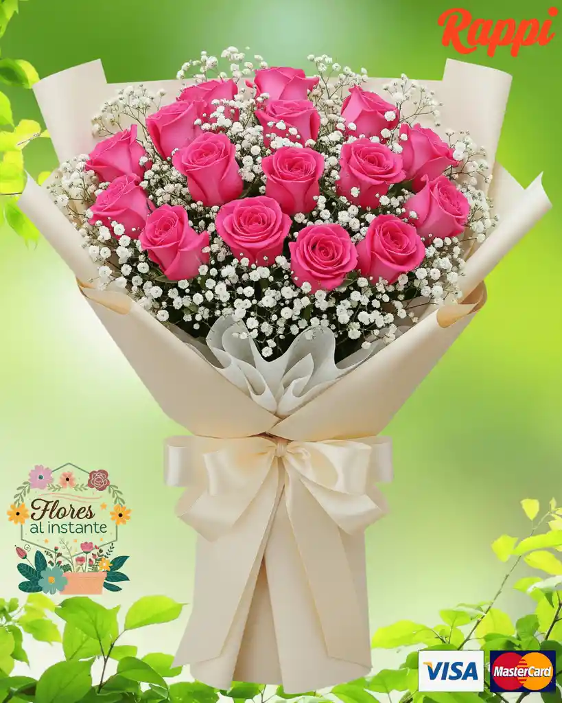 Hermoso Bouquet envuelto en papel coreano palo de rosa , con 24 rosas frescas, con un toque de gipsófila, para que enamores cada día.