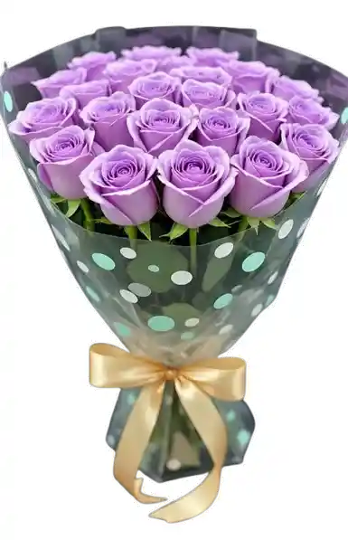 Bouquet de rosas lila cuidadosamente seleccionadas, envuelto en elegante papel decorativo y moño dorado. Un detalle sofisticado que transmite admiración, ternura y distinción.