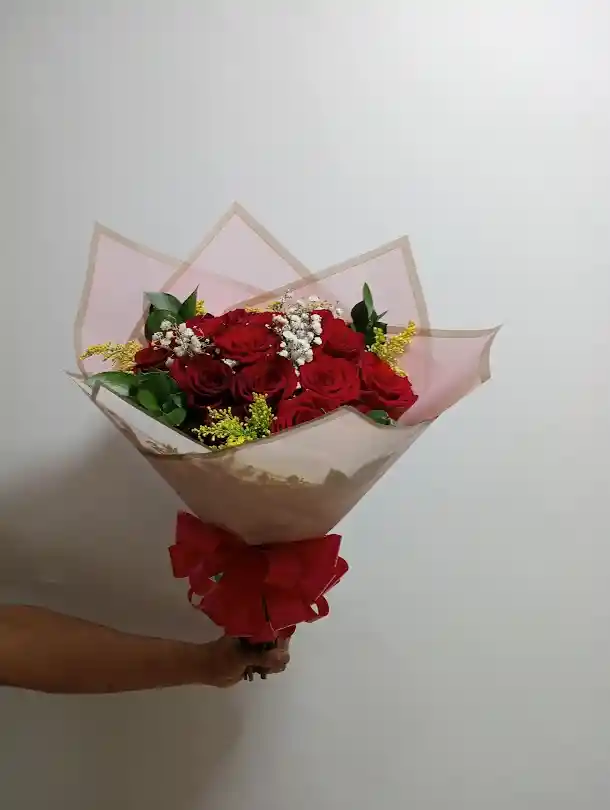 rosas rojas, papel coreano, follaje, moño