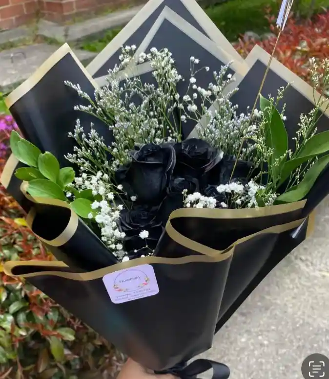 12 rosas. Negras adornada con follaje verde y jipsu blanco
