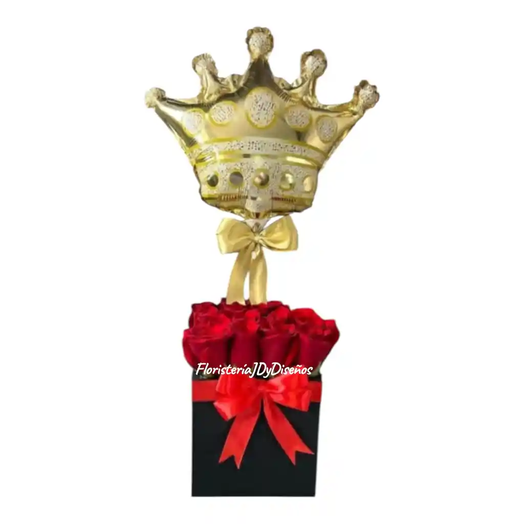 DELICADO HERMOSO ARREGLO FLORAL ELABORADO CON 1 DOCENA DE ROSAS ROJAS EN VASE DE MADERA CON GLOBO METALIZADO DE CORONA DE REINA R-10 Y MOÑO EN CINTA DE PAPEL