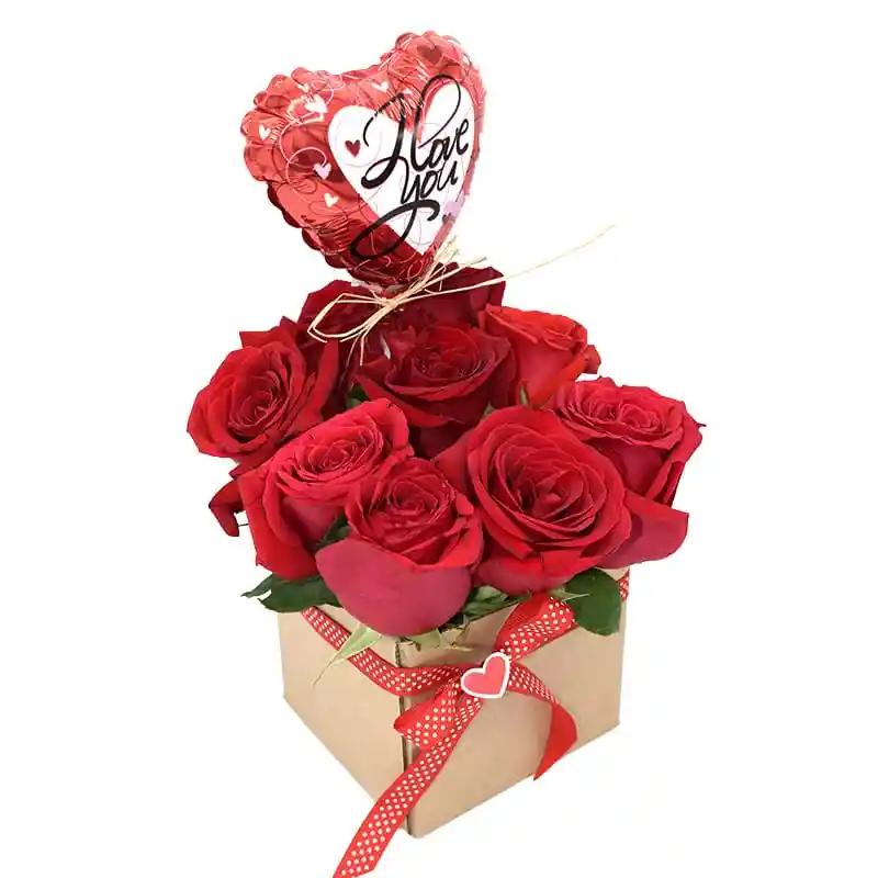 8 rosas Caja cartón cuadrada Moño rojo cinta papel Corazon rojo
