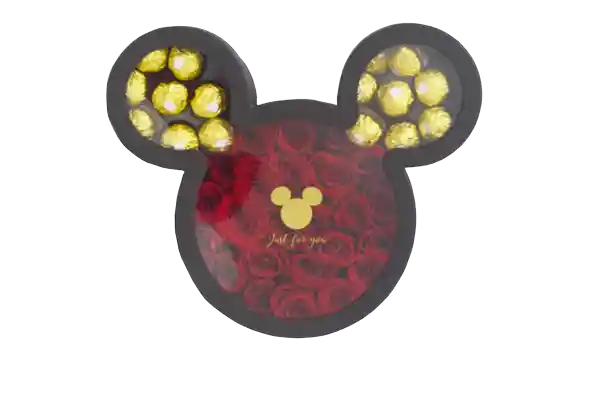 Elegante Caja en Forma de Mickey Repleta de Rosas Seleccionadas y Acompañada de 16 Chocolates Ferrero Rocher. Incluye Tarjeta (Favor Escribirlo Por el Chat)