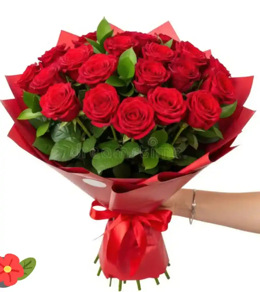 Bouquet con 36 tallos de rosas rojas tipo exportación, papel decorativo, moño, tarjeta con mensaje personalizado