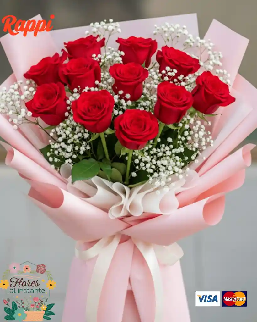 Este es un magnífico bouquet de mano compuesto por 12 rosas rojas, el símbolo por excelencia del amor profundo y apasionado. Las rosas están abundantemente complementadas con delicada gipsófila, que añade un toque etéreo y romántico, creando un contraste suave y armonioso. Todo el arreglo está elegantemente envuelto en un suave papel coreano de color rosado.