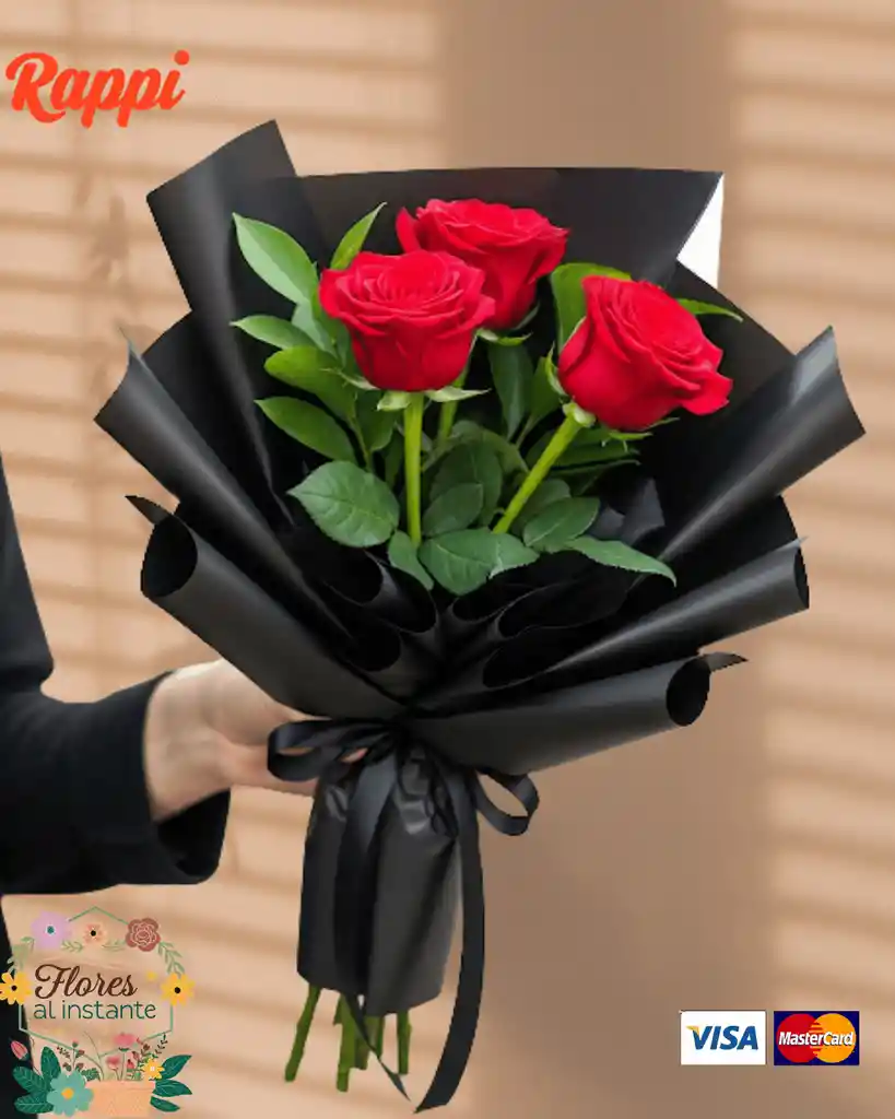 Este es un encantador bouquet de mano que incluye tres rosas rojas, que simbolizan el amor y la pasión. Las rosas están bellamente acompañadas de gipsófila, lo que le da un toque delicado y etéreo al arreglo. El ramo está envuelto en un papel coreano de color Negro, dando un toque de elegancia.