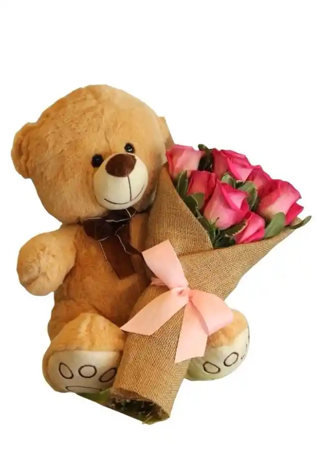Ramo floral de 8 unidades de rosas rosadas y peluche mediano