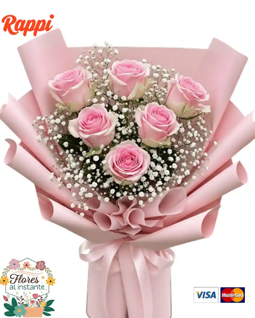 Este encantador bouquet está compuesto por 6 hermosas rosas rosadas, que simbolizan admiración y dulzura. Las flores están dispuestas en una elegante caída o cascada, con tres rosas en la parte superior, seguidas de dos en el centro y una sola rosa en la base, creando una forma armoniosa y atractiva.Para complementar la belleza de las rosas, el ramo incluye gipsófilas que añaden un toque delicado y aireado. Todo el conjunto está envuelto en suave papel coreano de color rosa.