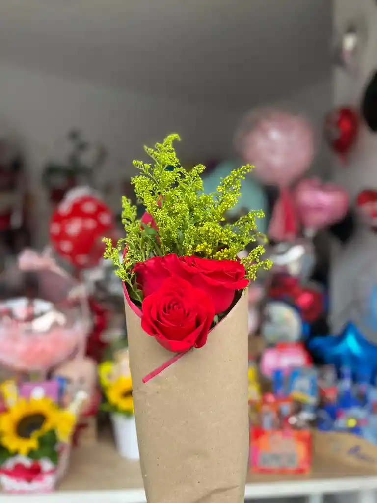 Rosas rojas x3, follaje, envoltura en bouquet, mensaje personalizado