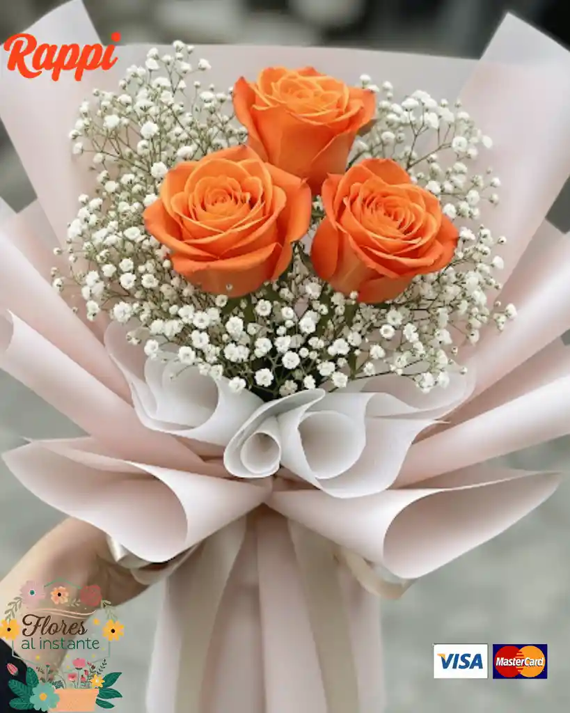 Este es un vibrante bouquet de mano que presenta tres rosas naranjas, simbolizando el entusiasmo, el deseo y la fascinación. Las rosas están delicadamente complementadas con gipsófila, lo que añade un toque etéreo y romántico al arreglo. El ramo está envuelto en un suave papel coreano de color claro.