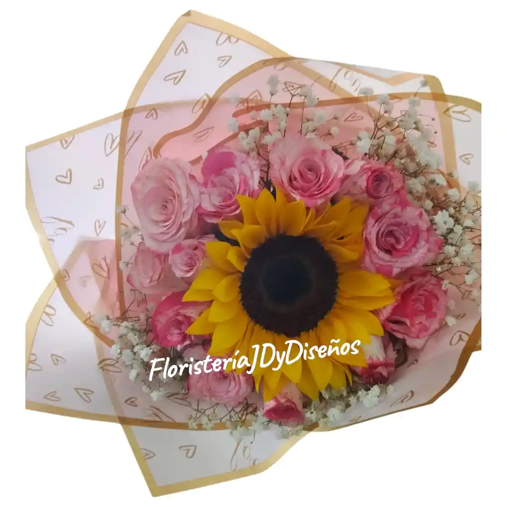 BOUQUE DE 1 UNA DOCENA DE ROSAS CON 1 GIRASOL ORGANIZADOS CON FOLLAJES Y PAPEL COREANO Y MOÑO EN CINTA DE PAPEL