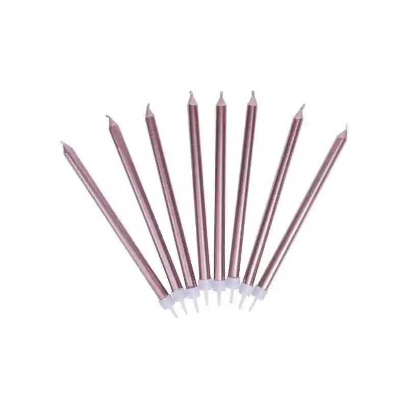 Incluye 6 velas (14 cms de largo, 5 mm de diámetro) con acabado metalizado liso y una base para cada vela.