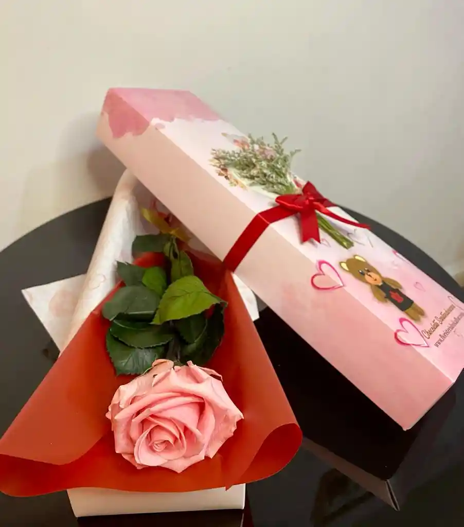 Inmortaliza tu amor con este precioso arreglo preservado: Natural que se somete a un proceso para que perdure por más de 1 año. Rose Pink Preserved, elaborado con una Rosa Medium Rosada acompañada de Gipsofilia preservada, empacada en papel coreano y va dentro de una linda y elegante caja negra con dorado y decoración en su tapa. Incluye: Tarjeta con el mensaje que desee enviar.