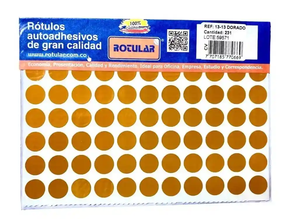 Rotulo Adhesivo Redondo dorado metalizado 13mm x 13mm. Paquete x 231 unidades. Marca Rotular 100% colombiano