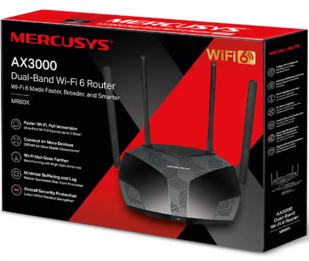 VELOCIDADES ÓPTIMAS DE WIFI 6 – Velocidades óptimas de WiFi 6 de hasta 3 Gbps para una navegación, transmisión y descarga más rápidas, todo al mismo tiempo. MÁS DISPOSITIVOS, MÁS DIVERSIÓN – Compatible con MU-MIMO y OFDMA para reducir la congestión y cuadruplicar el rendimiento promedio. WIFI QUE LLEGA MÁS LEJOS – 4 antenas de alta ganancia multidireccionales con Beamforming mejoran las conexiones estables en todo su hogar para señales de WiFi sólidas en cada rincón PROTECCIÓN DE SEGURIDAD GLOBAL – El último estándar WPA3 proporciona una mayor seguridad para su WiFi CONEXIONES CABLEADAS GIGABIT – Aproveche al máximo su acceso a Internet y transfiera datos a velocidades vertiginosas para un rendimiento óptimo AHORRO DE ENERGÍA ECO-FRIENDLY – Target Wake Time (TWT) reduce el consumo de energía para sus dispositivos móviles e IoT durante las transmisiones de datos MENOS INTERFERENCIA DE WIFI – Minimiza la interferencia de las señales vecinas para mejorar la eficiencia de transmisión con BSS Coloring CONEXIÓN INTELIGENTE – Elije inteligentemente la mejor banda disponible para cada dispositivos