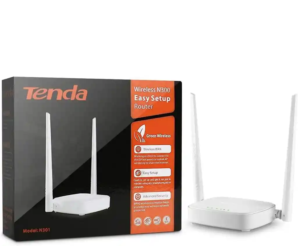 Router wifi tenda n301 Repetidor internet señal WDS Bridge,WISP Conexión inalámbrica. Ofrece una velocidad de 300Mbps. Banda única de 2.4 GHz. Posee 2 antenas externas y 2 internas. Tiene 4 puertos para conectarse. Con firewall integrado. Soporta el protocolo de seguridad WEP. Dimensiones: 90.5mm de ancho, 26mm de alto, 90.5mm de profundidad. Dispositivo que facilita conexión a la red. Con control parental.