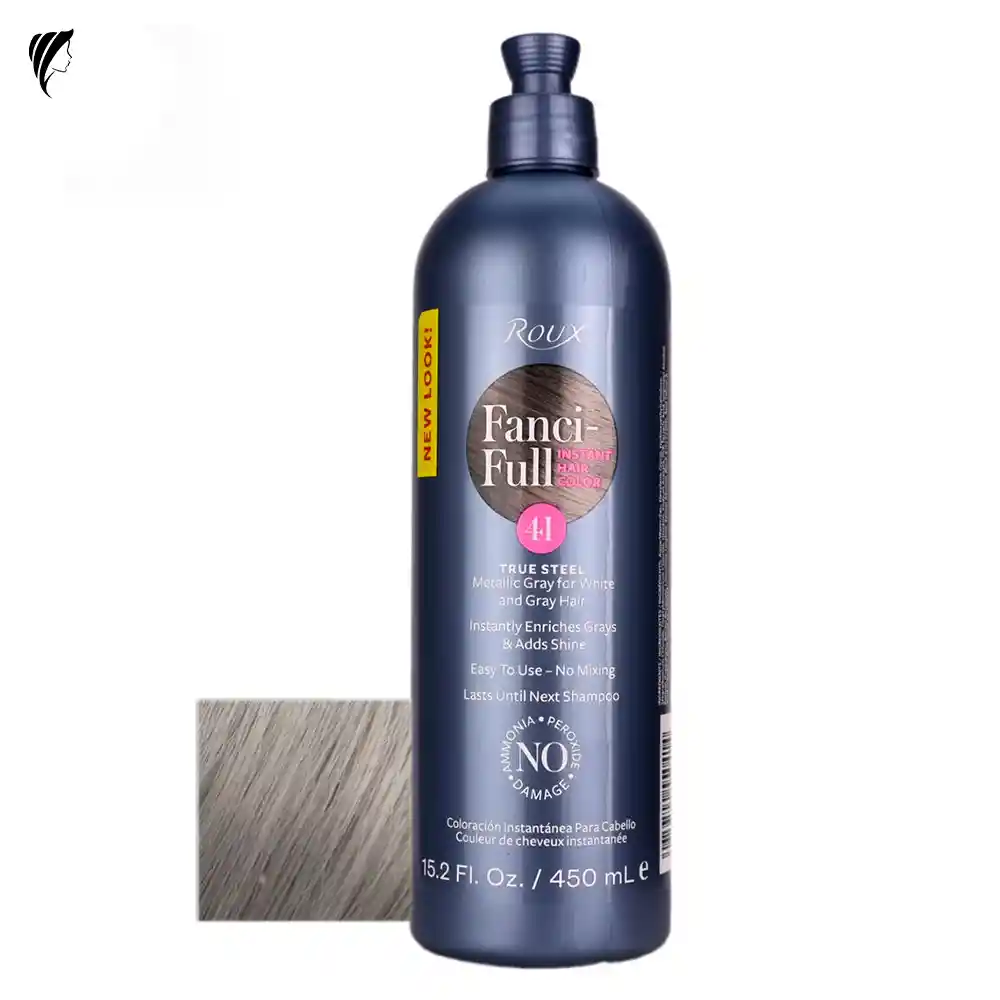 Roux Fanci-Full *41 (Gris acero puro) Coloración Temporal de Aclarado 450ml Descripción Una completa gama de tonos brillantes, para dar color al cabello devolviéndole suavidad y luminosidad. Gracias al aceite de argán y a las ceramidas. Fanci-Full recupera la fuerza del cabello mientras lo colorea y lo reestructura, aportándole un aspecto sano y brillante. Los pigmentos puros permiten dejar el cabello luminoso y crear magníficos reflejos. Su fresco perfume hace que sea agradable su aplicación. Gracias al bajo porcentaje de amoniaco actúa respetando la estructura del cabello. Aclara hasta 2/3 tonos y cubre los cabellos blancos al 100%. Modo de Uso Después del lavado, sobre el pelo húmedo y sin enjuagar. El envase alcanza para muchas aplicaciones. Eficacia / Beneficios Fanci-Full recupera la Fuerza del cabello mientras lo colorea y lo reestructura, aportándole un aspecto sano y brillante.