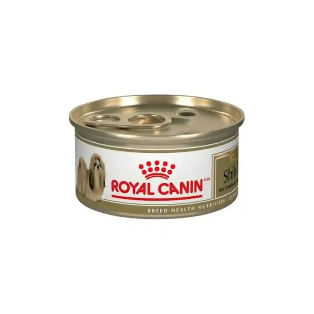Alimento húmedo Royal Canin Shih Tzu en lata de 85 g, especialmente formulado para perros de raza Shih Tzu adultos. Su receta está diseñada para cubrir las necesidades específicas de esta raza, favoreciendo la salud del pelaje, la piel y el sistema digestivo.