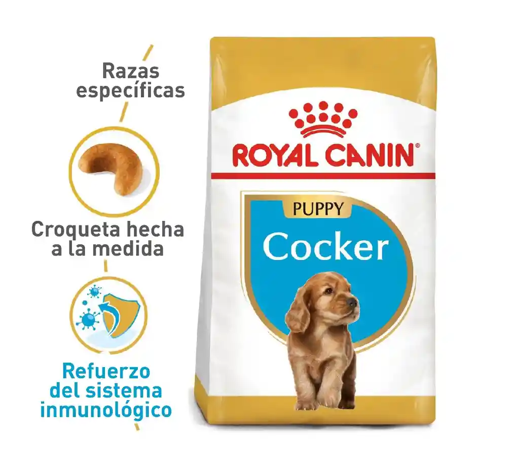 Para tu cachorro de Cocker, el crecimiento es una fase muy importante de su vida: es un momento de nuevos encuentros y cambios físicos. Durante esta fase clave de su crecimiento, el sistema inmunológico de tu cachorro se desarrolla de forma gradual. Cocker Puppy de ROYAL CANIN® es un alimento apto para cachorros de hasta 12 meses que contiene un complejo patentado de antioxidantes, como la vitamina E, que refuerza las defensas naturales de tu cachorro.
