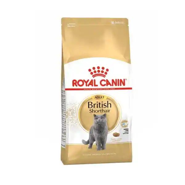Royal Canin British Shorthair Adult 2 kg es un alimento seco especialmente formulado para gatos adultos de la raza British Shorthair (más de 12 meses). Su fórmula está diseñada para mantener la musculatura y apoyar la salud de huesos y articulaciones —gracias a un contenido equilibrado de proteínas de alta digestibilidad (L.I.P.), grasas y L‑carnitina—, además de incluir ácidos grasos omega‑3 (EPA/DHA) para la función articular y cardíaca. La croqueta tiene una forma amplia y curvada, adaptada a su mandíbula robusta, fomentando la masticación y ayudando a la higiene bucal. También aporta prebióticos y fibras para favorecer la salud digestiva, nutrientes esenciales como taurina, más minerales balanceados para el bienestar urinario. Proteína 34 %, grasa 19 %, y fibra 5.3–5.4 %, junto con vitaminas (A, D3), oligoelementos y antioxidantes completos. Las recomendaciones de ración diaria varían según peso y nivel de actividad, por ejemplo, entre 42 g y 52 g al día para gatos de 3–4 kg con actividad moderada.