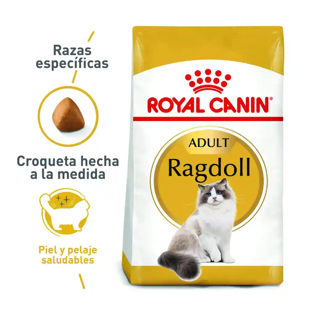 Royal Canin Ragdoll Adulto es un alimento seco diseñado específicamente para gatos de raza Ragdoll mayores de 12 meses, Este producto está formulado para satisfacer las necesidades nutricionales únicas de esta raza, teniendo en cuenta su tamaño, pelaje y predisposición a problemas cardíacos y articulares,
