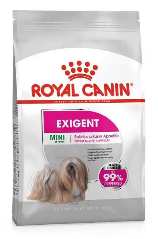 Cuando come, tu perro tiene en cuenta el olor, el tamaño de cada bocado y la textura de su alimento. Para conseguir que tu perro coma un alimento saludable, y no solo los premios que devora ávidamente cuando no se come su comida, necesitas ofrecerle una comida sana, nutricionalmente completa e irresistible hasta para los paladares más exigentes. Exigent Mini de ROYAL CANIN® es un alimento apto para perros exigentes de hasta 10 kg y contiene todos los nutrientes que tu perro necesita para mantenerse sano. La croqueta de forma rectangular de Exigent Mini de ROYAL CANIN® tiene una agradable textura crujiente y está rellena de un paté, repleto de sabrosos nutrientes.