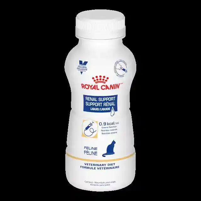 ROYAL CANIN VETERINARY DIET Feline RENAL SUPPORT LIQUID es una dieta para gatos formulada para favorecer la salud renal gracias a su bajo nivel de fósforo y proteínas de alta calidad. Esta dieta es altamente digestible y su alta densidad energética permite reducir los volúmenes de alimentación. Suministrar bajo supervisión veterinaria. ROYAL CANIN VETERINARY DIET Feline RENAL SUPPORT LIQUID está indicado únicamente para una alimentación intermitente o complementaria.