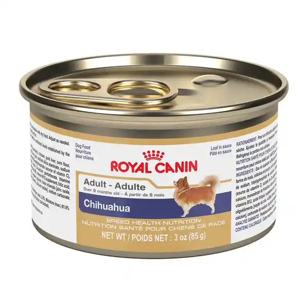 Royal Canin Chihuahua Wet Lata, el Alimento Húmedo Chihuahua Adult Loaf In Sauce es el Complemento Ideal de la Fórmula Seca Para Perros Chihuahua Adulto de Royal Canin, la Fórmula Chihuahua Adult Loaf In Sauce Está Diseñada Especialmente Para Perros Chihuahua Mayores a 10 Meses de Edad, Salud de Piel y Pelaje.