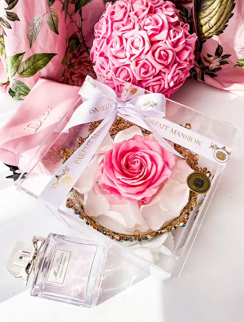 Corona metalica enchapada con pedreria, trabajo manual, importadas desde San Petesburgo, Rusia. Viene en caja de acrilico, sobre una cama de petalos preservados, una rosa natural eternizada, moneda banada en oro. Adicional trae tarjeta para el mensaje con llave maestra Baroque.