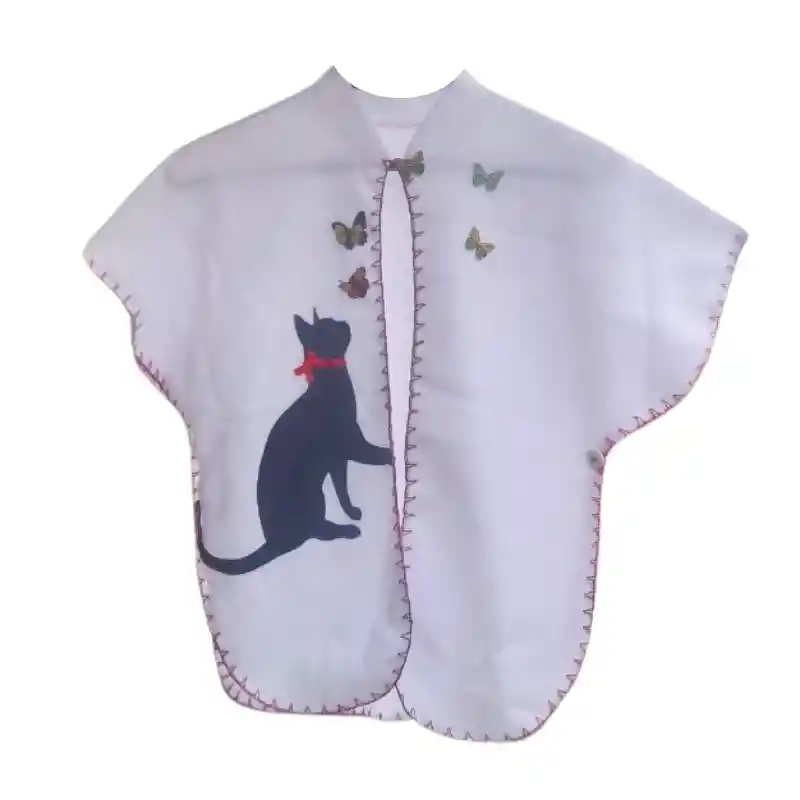 Capa tipo poncho hecha a mano, ideal para niñas. Confeccionada en tela suave y cómoda, decorada con estampado de gato o perro y detalles únicos como mariposas o flores en madera. Un diseño original que brinda estilo y calidez en días frescos. Características destacadas: Hecha a mano con terminaciones bordadas Liviana, cómoda y de fácil lavado Ideal para actividades escolares, salidas o fotos especiales Medidas: Ver imágenes para dimensiones detalladas de cada diseño. Disponibilidad: Unidades limitadas Origen: Producto colombiano hecho a mano