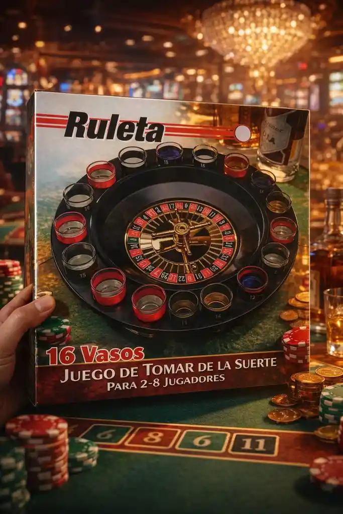 🎯 Características del juego 🎡 Ruleta con vaso shots: Incluye una ruleta giratoria con números. 🥃 16 vasos (shots): Cada uno marcado con un número. 👥 Para 2 a 8 jugadores: Ideal para grupos pequeños o medianos. 🎲 Dinámica de azar: El resultado depende completamente de la suerte. 🍹 Personalizable: Puedes llenar los vasos con diferentes bebidas (alcohol o sin alcohol). 🪶 Fácil de usar: No requiere reglas complicadas. 🎮 ¿Cómo se juega? Preparación: Coloca los 16 vasos en sus posiciones. Llénalos con bebidas (pueden ser iguales o diferentes). Turnos: Cada jugador gira la ruleta. Resultado: La bola cae en un número. Acción: El jugador debe beber el shot correspondiente a ese número. Variantes (opcional): Puedes agregar reglas como: 🔁 Volver a girar 🤝 Elegir a alguien más para beber ❌ Saltar turno 🎉 ¿Por qué es perfecto para un plan de amigos? 😂 Genera risas instantáneas: La incertidumbre hace todo más divertido. 🤝 Rompe el hielo: Ideal para grupos nuevos o reuniones. 🔥 Ambiente dinámico: Nadie se queda fuera, todos participan. 🎯 Simple y rápido: No necesitas aprender reglas complejas. 🍻 Versátil: Funciona con o sin alcohol, según el grupo. 📸 Momentos memorables: Perfecto para crear recuerdos (y fotos épicas).