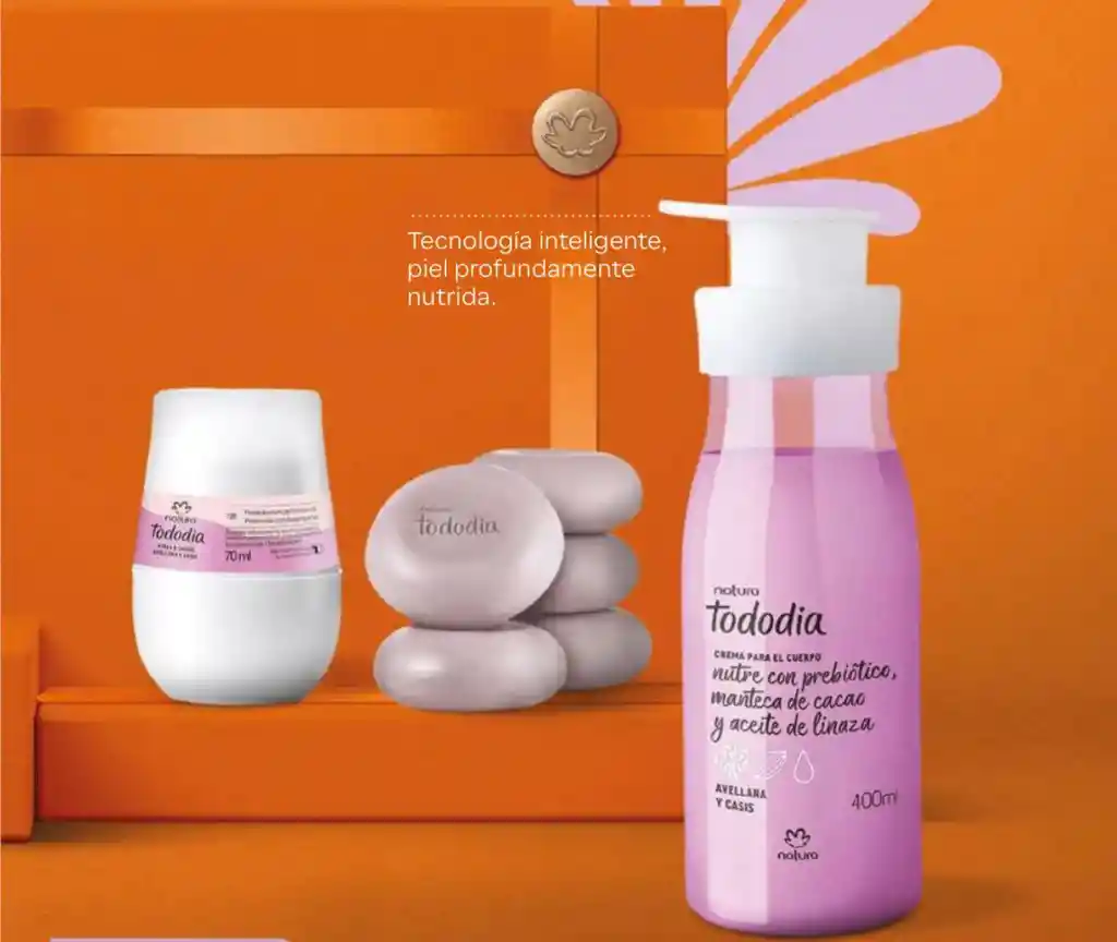 1 crema para el cuerpo 400 ml 1 caja de 5 jabones 1 desodorante antitranspirante avellana y casis.