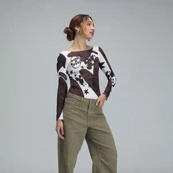 Body café estampado de manga larga con cuello tipo barco. Espalda descubierta con escote amplio. Cierre con gafete en la parte inferior para un mejor ajuste. Composición: 82% poliéster, 18% spandex. La modelo mide 1,69 m y usa talla XS. Cuidados especiales: Leer la etiqueta de cuidados antes de lavar.