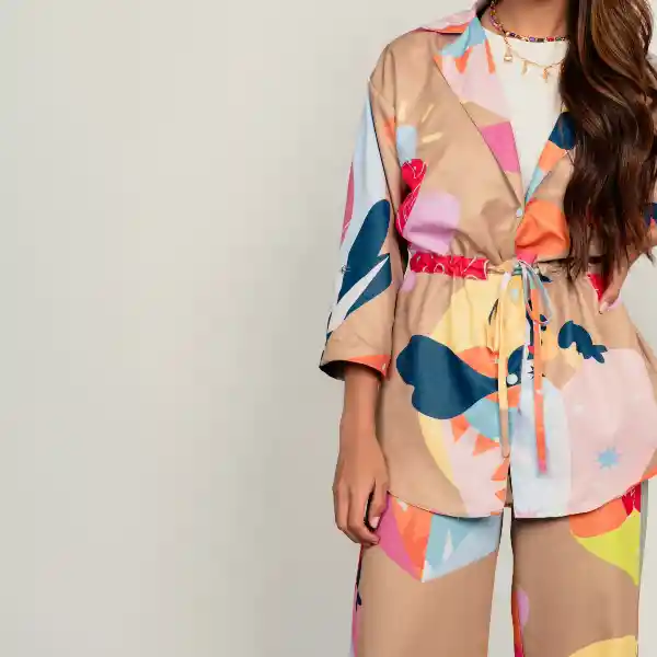 Chaqueta color camel estampada con nuestro print AMOR INCONDICIONAL, con cuello tipo solapa, manga tipo 3/4, puños terminados con charretera, botones a presión y cordón interno de ajuste. Composición: 100% Poliéster. La modelo mide 1,70 y está usando talla XS. Cuidados especiales de la prenda: No planchar el arte. Leer la etiqueta de cuidados.
