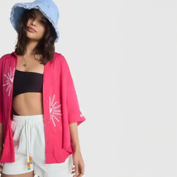 Camisa playera oversize color fucsia, con mangas hasta los codos, cuello camisero y estampado en el frente y en el puño. Composición: 98% rayón, 2% elastano. La modelo mide 1,64 m y usa talla 36. Cuidados especiales: No planchar sobre el diseño. Leer la etiqueta de cuidados antes de lavar.
