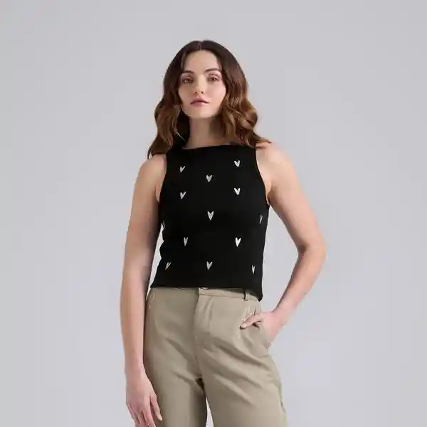 Top negro de cuello redondo y manga sisa con arte bordado en el delantero. Composición: 63.7% poliéster, 34.3% algodón, 2% elastano. La modelo mide 1,70 m y usa talla M. Cuidados especiales: Leer la etiqueta de cuidados antes de lavar. .